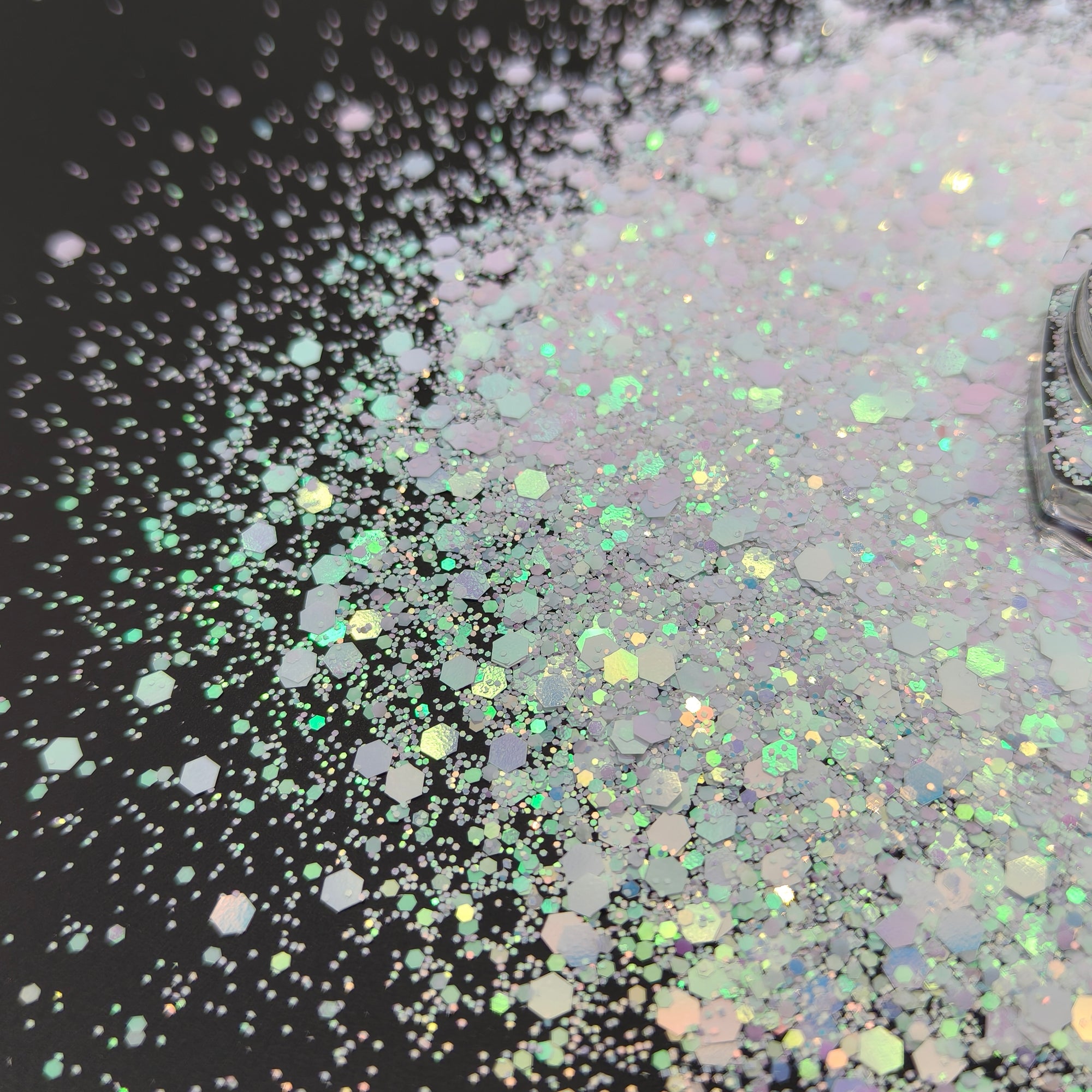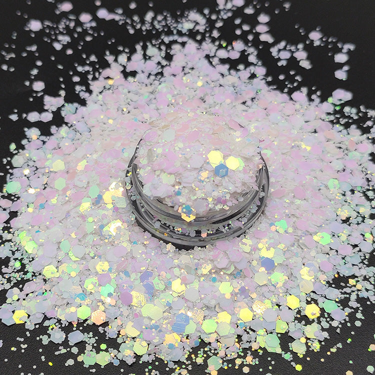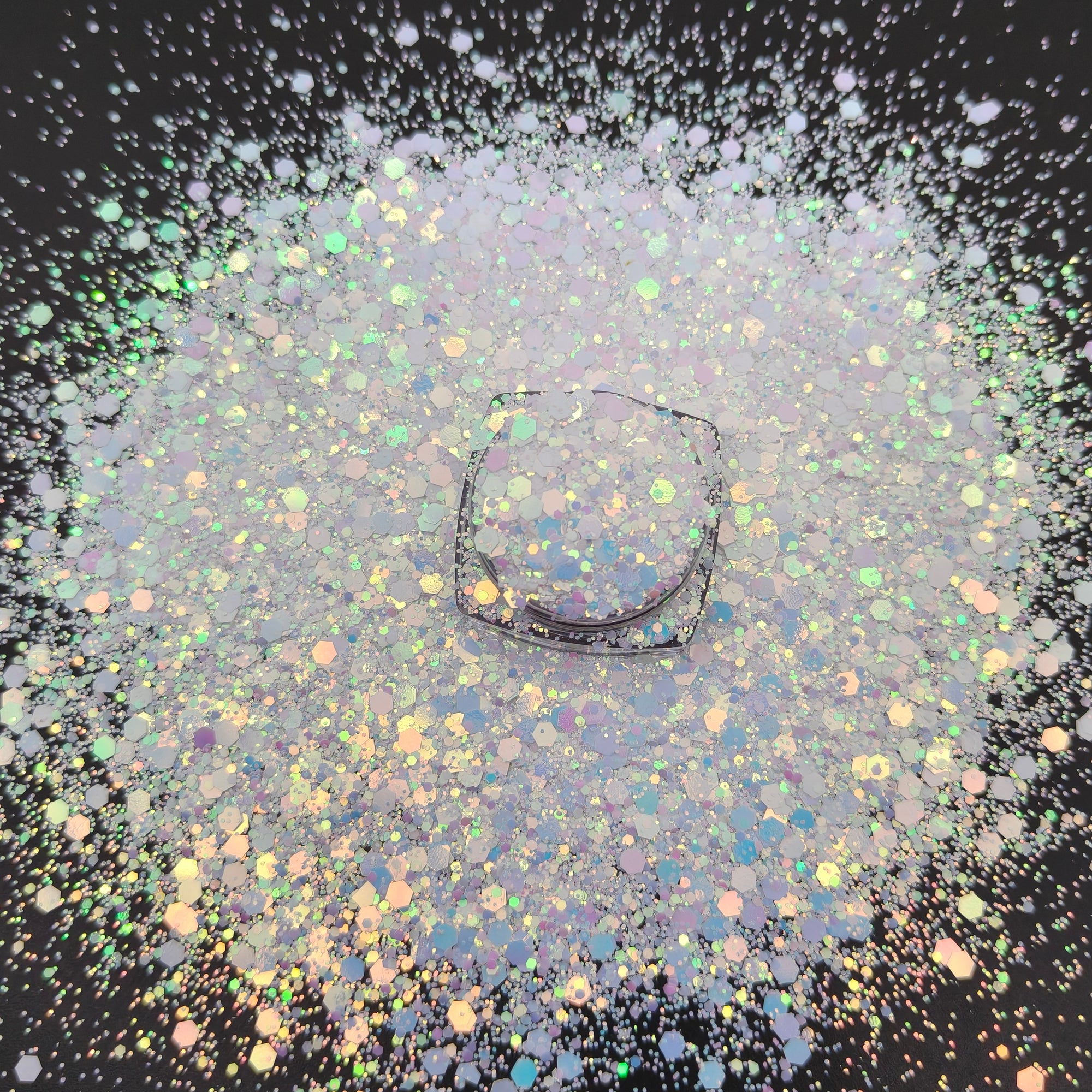 A chunkuy mix of white glitter with some shades of light pink & blue